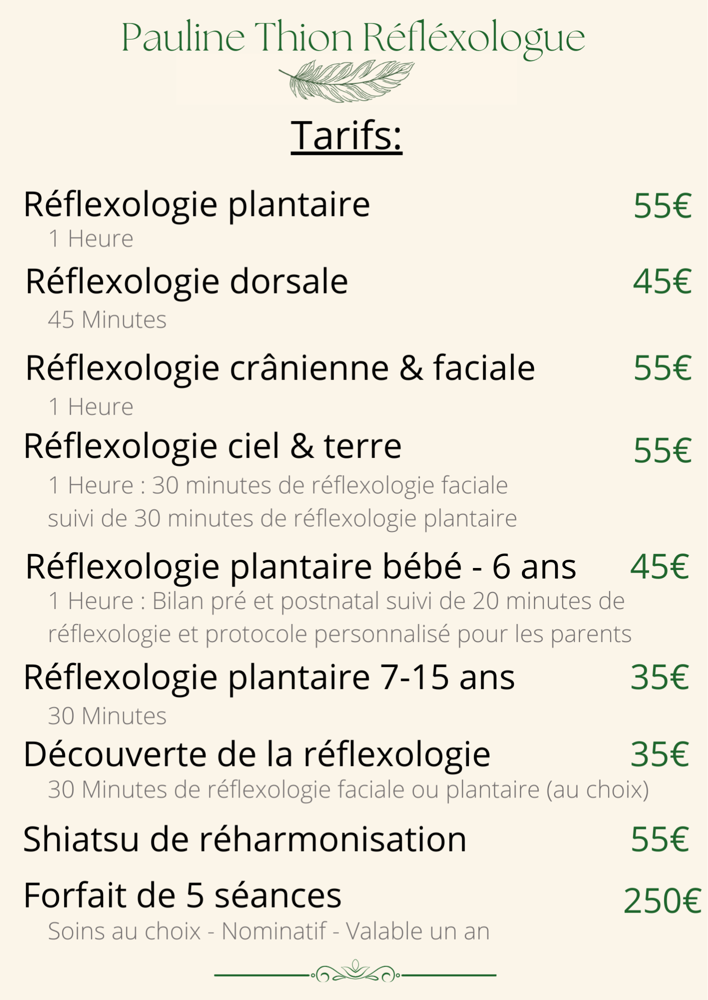 Remboursement : Certaines mutuelles peuvent prendre en charge la réflexologie, renseignez-vous auprès de la vôtre.